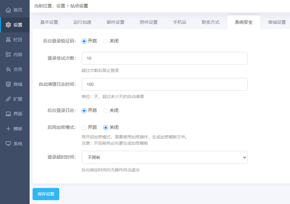 进入系统后台--设置--系统安全:进一步设置系统相关安全参数