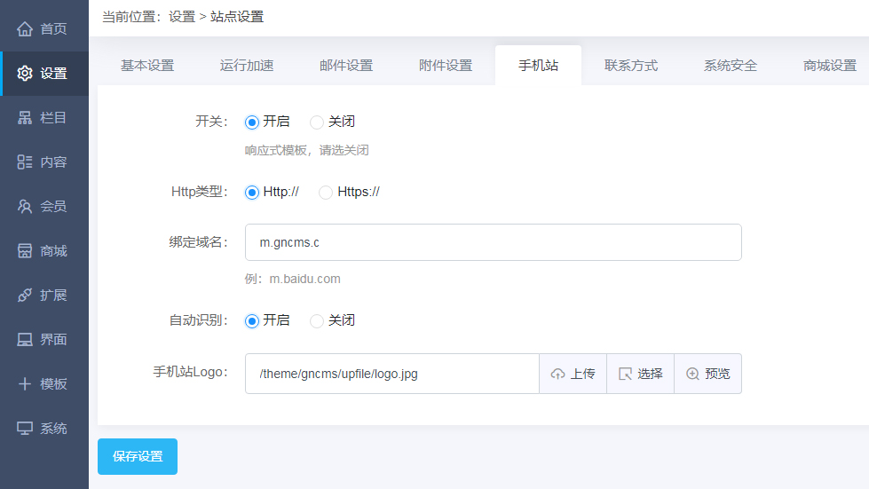 进入后台--设置--手机站--填入手机站域名,保存即可 ,效果如下图: