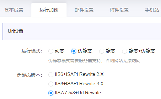 1、如果不支持伪静态,请打开后台设置--运行加速--设置运行模式为“动态”,保存后即可恢复动态模式访问。