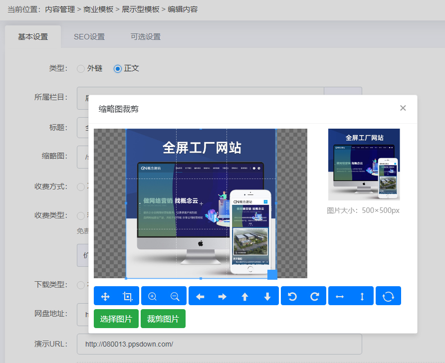 第三步:进入后台--内容--管理上述栏目下的内容,发布或修改内容时, 上传缩略图即可出现裁剪功能