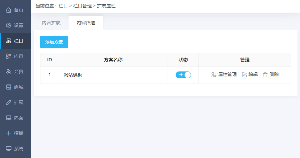 第一步:进入后台--栏目--扩展属性--内容筛选,先添加一个“方案”,然后点击“属性管理”,为该方案设置属性