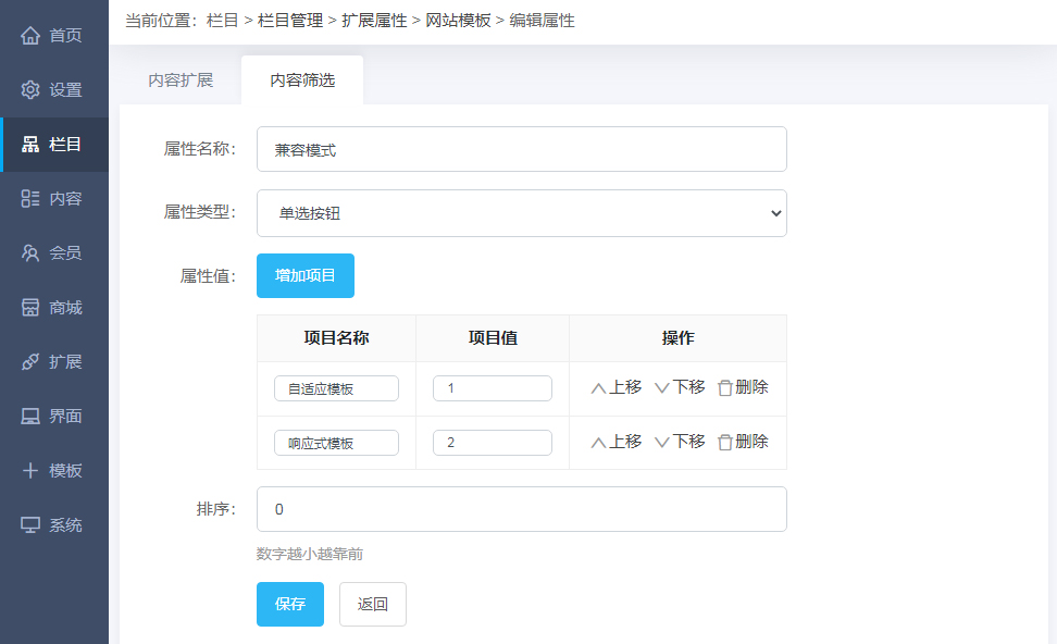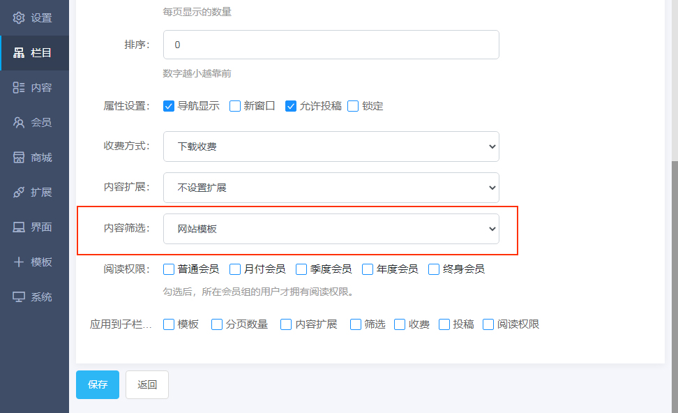 第二步:进入后台--栏目--栏目管理--选择需要增加筛选功能的栏目,设置内容筛选项